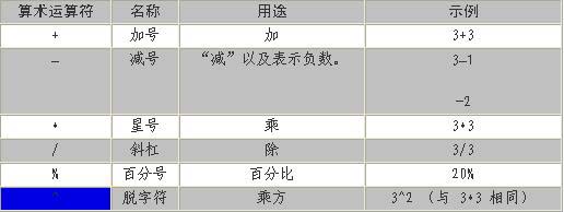用于完成基本的数学运算,如加法、减法和乘法,连接数字和产生数字结果等。各算术运算与用途如下表所列。