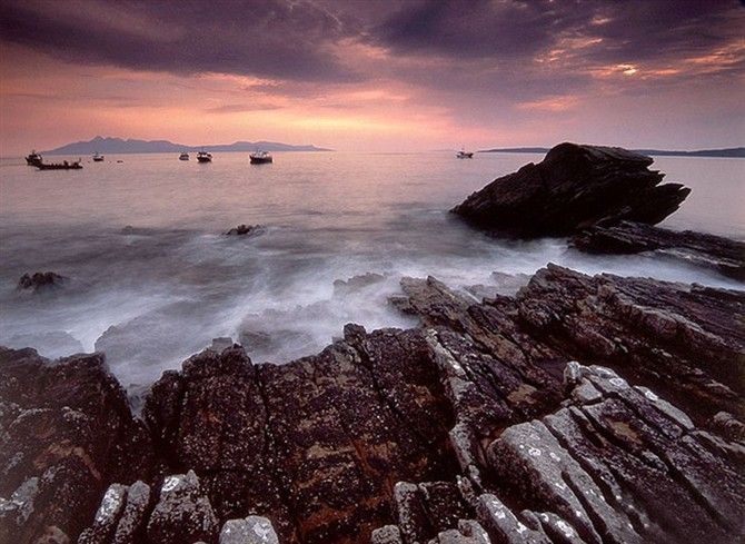晨曦,海浪拍打着焦石,渔民们驾船出海